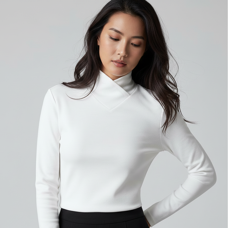 Sur la photo, ce modèle dégage une impression de calme et de modernité. C’est une pièce intemporelle que l’on porte aussi bien seule que sous une veste, parfaite pour une tenue quotidienne ou un moment plus habillé. Un essentiel qui mise sur le confort et la discrétion.