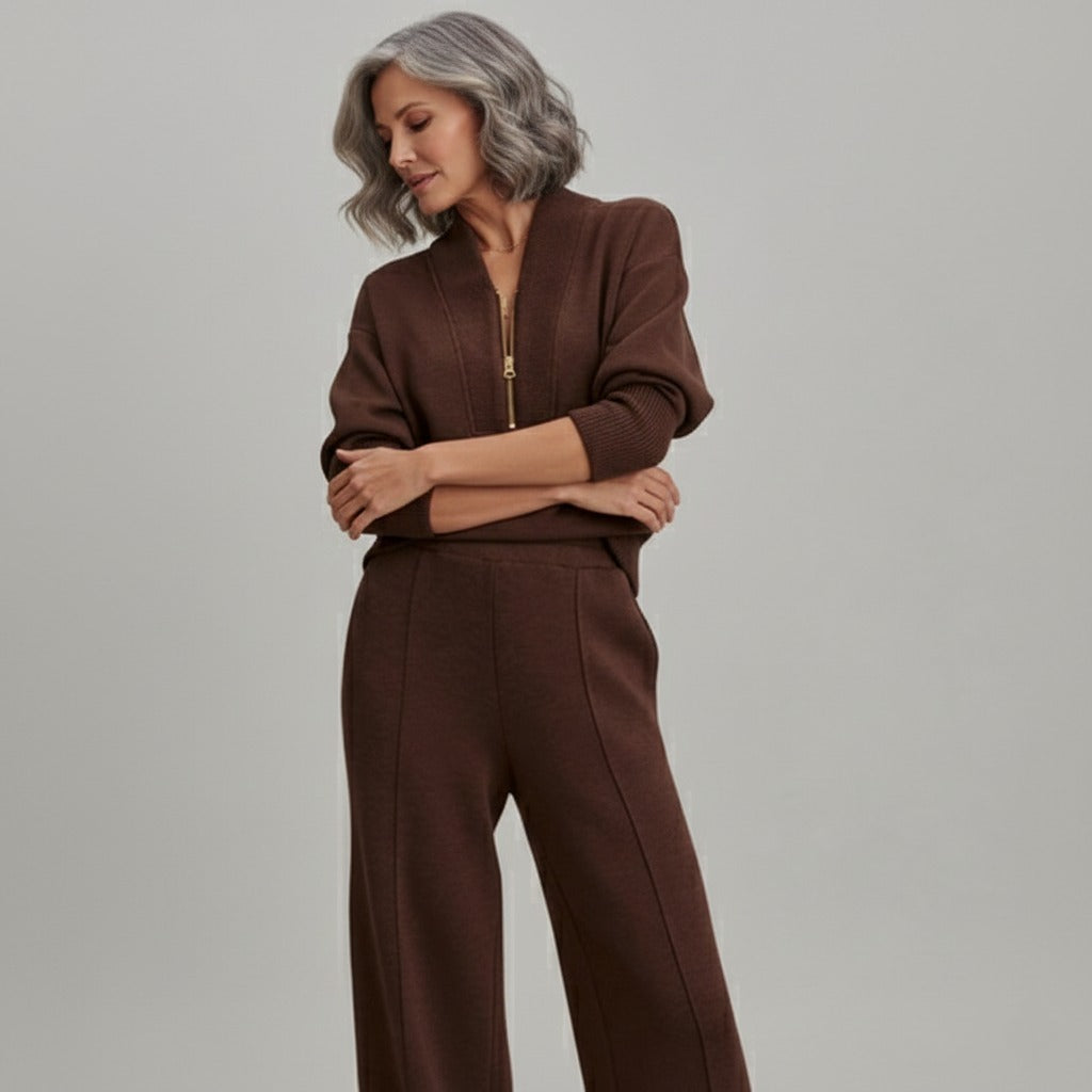 L’ensemble Amélie associe un style décontracté à une finition soignée, idéal pour celles qui recherchent le confort sans renoncer à une allure élégante. Le haut à col zippé apporte une touche moderne et permet d’ajuster le style selon l’occasion, tandis que la maille douce offre une sensation agréable tout au long de la journée.