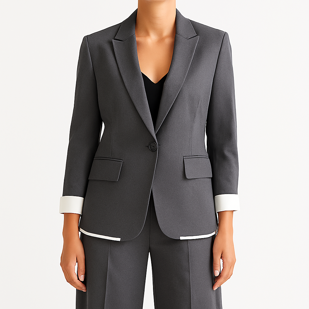 Détail distinctif : coloris gris classique, blazer + pièce assortie dans un silhouette moderne et soignée — une pièce de choix qui allie intemporalité et design contemporain.